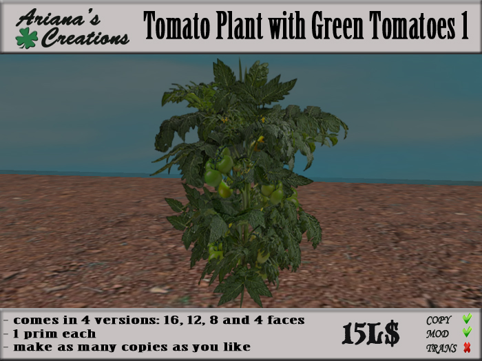 The texture set contains one tomato plant with green tomatoes in 4 variation: 4, 8, 12 and 16 sides prim plant.