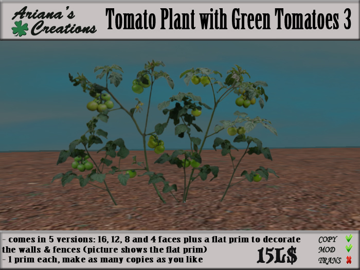 The texture set contains one tomato plant with green tomatoes in 5 variation: 4, 8, 12 and 16 sides prim plant plus a flat prim plant to decorate the walls and fences.