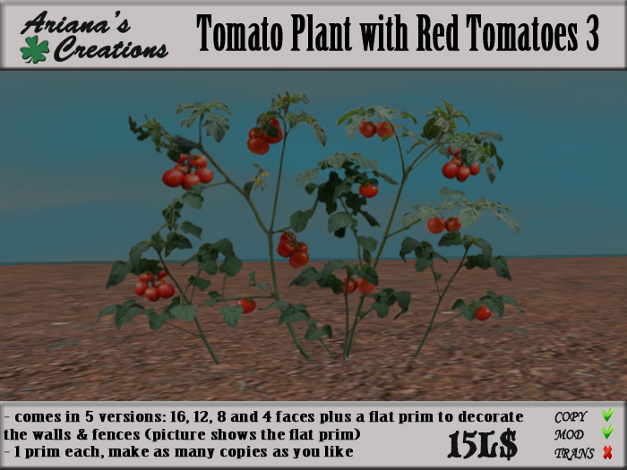 The texture set contains one tomato plant with red tomatoes in 5 variation: 4, 8, 12 and 16 sides prim plant plus a flat prim plant to decorate the walls and fences.